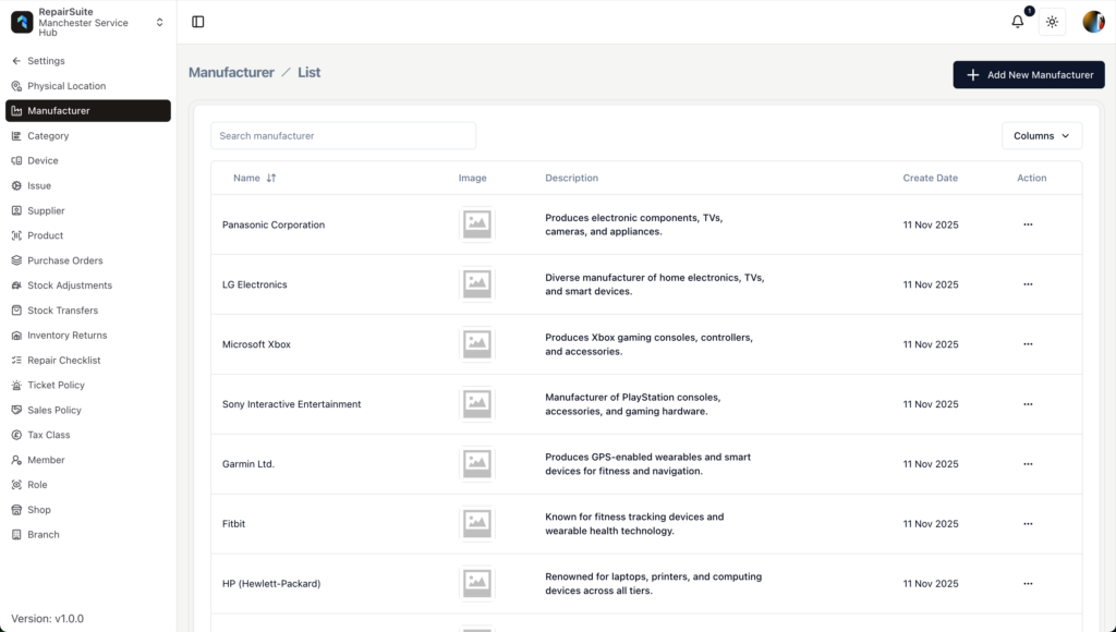 The Manufacturer section allows you to manage all brands associated with devices, products, and inventory inside RepairSuite.